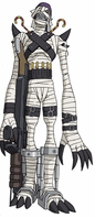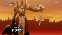 Doumon is one of the servants that Tuwarmon sealed away as backup for AxeKnightmon. He was sealed within Honey Land, and is released in order to aid Ewan against his sister, Nene. He specializes in illusions, and uses his powers to isolate Nene from her allies in a facsimile of her hometown, then to render Laylamon Combined invisible so that she can attack Shoutmon X5B and MetalGreymon without fear of reprisal. In order to combat Doumon's illusions, Wisemon advises Nene to digifuse him and Hi-VisionMonitamon with Mervamon's sword. Using her new detection abilities, Mervamon Wide-Hi-Vision Sword is able to see through Doumon's illusions and slay the sorcerer. Ewan and The Land of Illusion