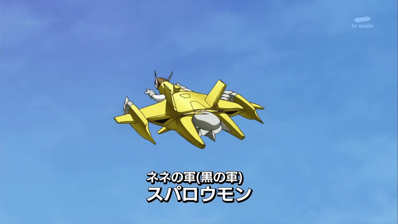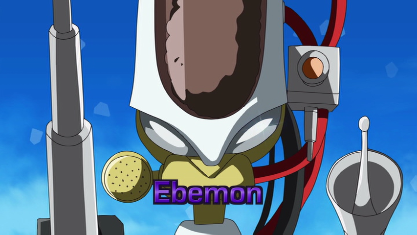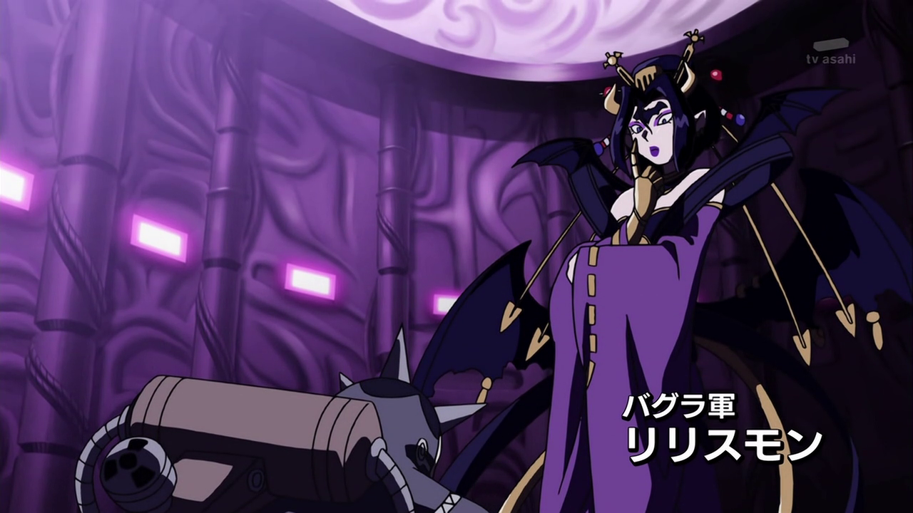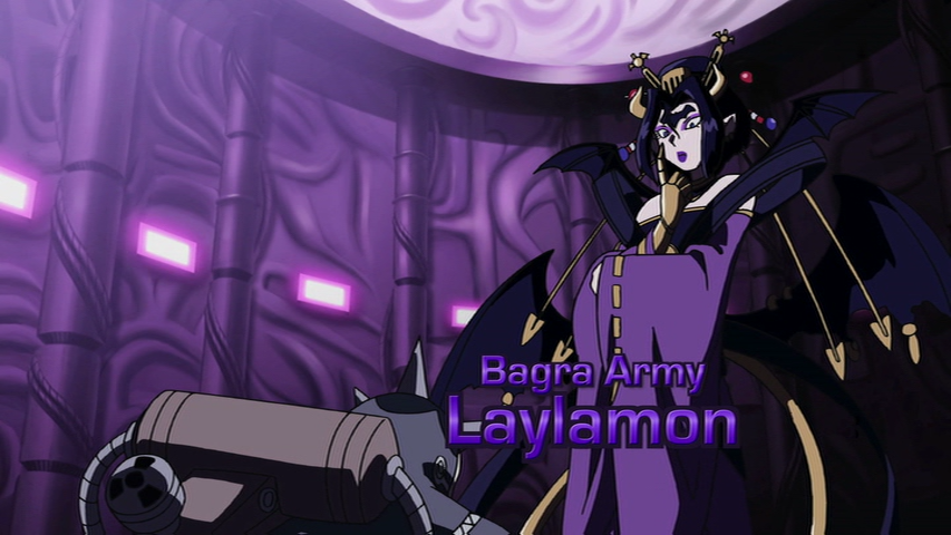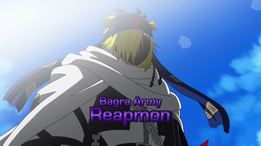 There, the Fusion Fighters' Digimon attack them, all with a glowing purple mark, on their foreheads. Reapmon recognizes the mark as the same ones the Warriors had on them. Laylamon appears and reveals her subordinate Ebemon, who enspells others to view all as enemies. Reapmon shoots Ebemon to free the hypnotized Digimon and turns his weapons on Laylamon, who responds by impaling him with her hand. In response, Mikey forms Shoutmon X4, who destroys Ebemon. Laylamon proceeds to attack the weakened Reapmon, but Shoutmon X4's sword prevents her from doing so, only Reapmon to collapse from Laylamon's poison.