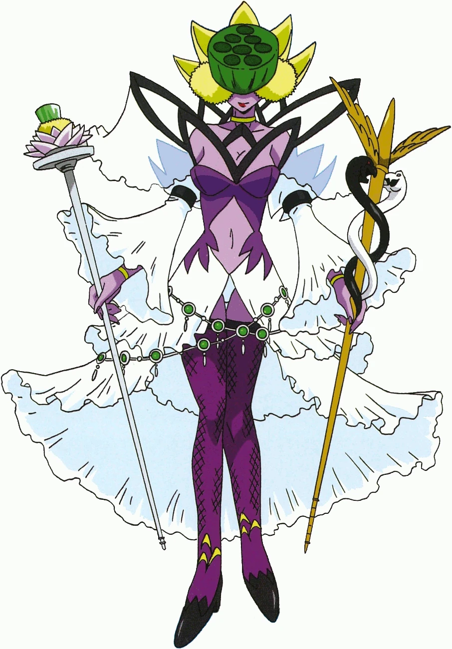 BioRotosmon is BioQuetzalmon's next stage, which she gained after having her body combined with the data of a Mega Digimon, based on Lotosmon which, at the time of its debut, was not released yet.