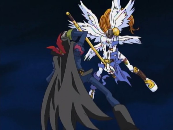 Meanwhile, Patamon's anger has subsided, and he is searching for T.K. at the park, mainly because he heard two girls talking about it earlier. When he notices the battle between the two powerful Digimon, he realizes T.K. is in danger. He digivolves to Angemon and, with WereGarurumon's help, weakens Myotismon, causing him to retreat. T.K. is in tears while apologizing to Patamon they make their way back through the streets towards the subway, reminiscing of their short-lived friendship with Pumpkinmon and Gotsumon. Meanwhile, Gatomon is watching Kari Kamiya, who she still suspects is the eighth child, and is planning to take her out the next time she approaches her.