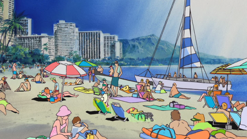 In Digimon Adventure: Our War Game!, when Taichi "Tai" Kamiya receives Mimi Tachikawa's postcard, she is enjoying herself in Waikīkī.