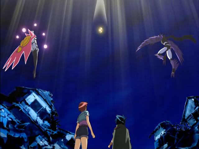 As Dynasmon X fights against Cherubimon (Evil) X and Ophanimon Falldown Mode X, Ophanimon X and Cherubimon (Good) X arrive to help out the Royal Knights and fight against their evil counterparts, which allows Dynasmon to help Magnamon X in its fight against Beelzemon X. Two Lights / An Even Darker Scheme