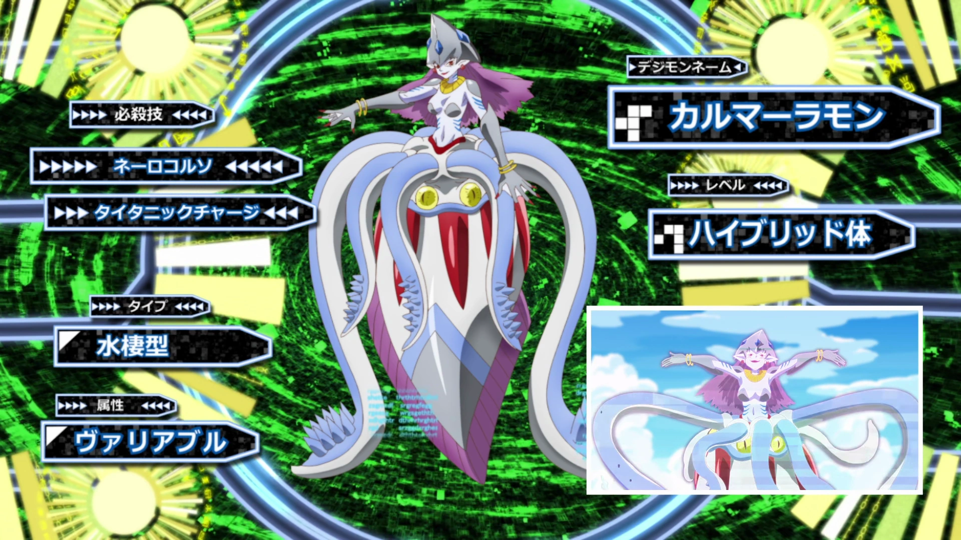 Hiro Amanokawa: "Calamaramon!"" Angoramon: ""Calamaramon attacks by spinning like a drill. It's at home in the water & in the air."" Jellymon: ""The ocean is so vast & deep, there could be monsters that can swallow a whale! Darling, what would you do if something like that opened its mouth & chased you?"" Kiyoshiro Higashimitarai: ""I'm never getting on a boat!"