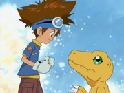 - In a shot of Tai feeding Agumon from the side, the black band on Tai's left arm is missing.