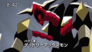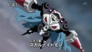 Nene rushes out and is faced by SkullKnightmon, who sends Axemon back to the black castle to support them. SkullKnightmon taunts Nene and moves to kill her, but Sparrowmon, having sneakily disengaged from the digifuse, saves her. Returning to Shoutmon X5, they drive him off. Meanwhile, Beelzemon attempts to send Mervamon ahead, explaining about how he intends to get his revenge on Laylamon for what she did to him. Mervamon agrees and go forward, with Beelzemon guarding her back from Laylamon. She saves Nene and holds off the army as Nene runs toward the black castle, where Whispered digifuses Axemon to himself to become his Darkness Mode and gets the upper hand. His attention is then drawn to the Generals' duel, where Mikey manages to break Ewan's weapon and then strike him. He then baits Ewan into striking back with a punch, the feedback of which forces him to pause when combined with Mikey's and Nene's words. When Nene mentions returning home, however, Ewan breaks and digifuses Tuwarmon with all of the Bagra Army troops and the energy from the Underworld itself into Ruthless Tuwarmon Beast Mode, leading Whispered to run away.