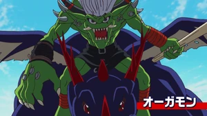 As they speak, however, Tylomon attack Whamon, and Dokugumon attack the temple, with the temple attack overseen by Ogremon who is riding a Blue Coredramon. Valdurmon's power protects the DigiDestined, and Valdurmon directs them to cross to sea to the Cloud Continent to find the Holy Digimon who fight among the warriors. Before they can finish, the Dokugumon manage to do enough damage to dispel the manifestation and trap the DigiDestined in a web. Eventually, they decide to use Birdramon's power to escape the web, and then use Greymon to break the encirclement. Ogremon calls a swarm of Green Coredramon to search for them, leading the four to instead hide.