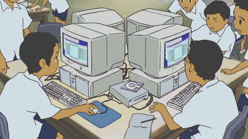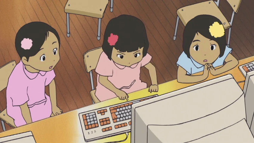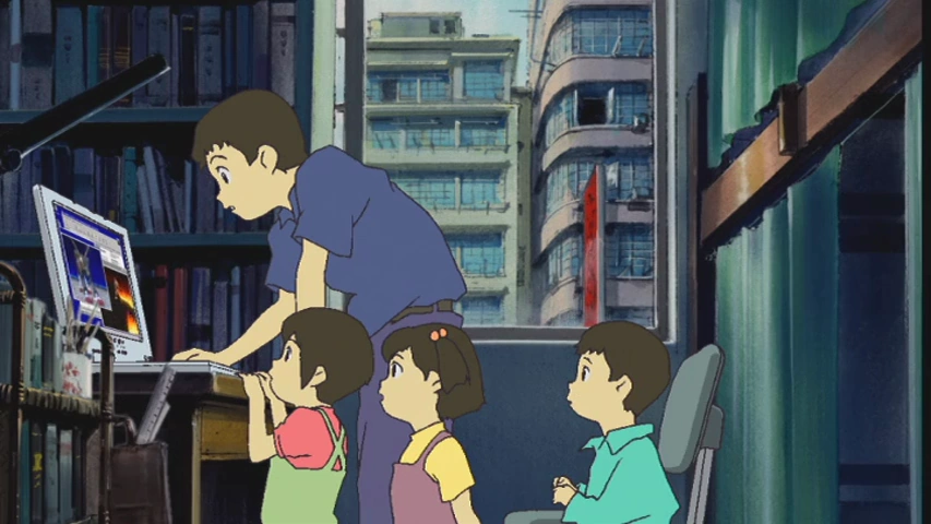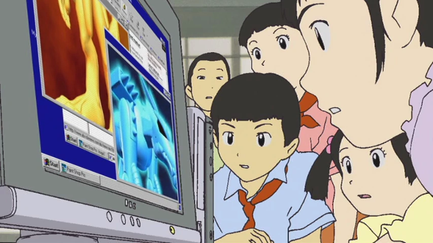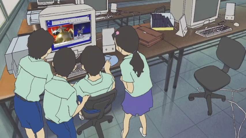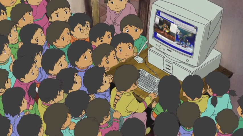 Japanese children in their classroom. They watch Agumon and Gabumon warp digivolve to WarGreymon and MetalGarurumon.