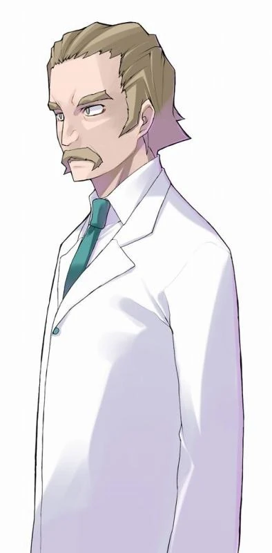Yakov is a man with lightly tanned skin, cream-colored hair, brownish gray eyes, and a short mustache. He wears a white shirt, a blueish green tie, a white lab coat with a green button in the top, black pants, and brown shoes.