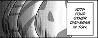When Reiji Shinonome, Wanya, Eve, and Kuwagamon are traveling through the Network to Kyoto, MetalGreymon appears to attack them. Eve assumes MetalGreymon to be digivolved from Devidramon. MetalGreymon injures Reiji, which causes Wanya to digivolve to DarkTyrannomon and angrily attack the Cyborg Digimon while its data is still unstable. Wanya eventually stabilizes but MetalGreymon still has upperhand until Kuwagamon starts to help. Wanya restricts MetalGreymon with a torii and Kuwagamon puts it into freeze stasis. At night, while reading MetalGreymon's data, Eve realizes it is not Devidramon and doesn't have the time machine. Beyond the Rain When Zen, Megadramon, Andromon, and MetalMamemon ambush Reiji, Wanya, and Kuwagamon in the Network, Zen notes MetalGreymon's frozen data inside Kuwagamon and says all the necessary pieces to form Machinedramon have been gathered. Branches After Machinedramon is formed, Zen sends hundreds of low-quality copies of Megadramon, MetalGreymon, Andromon, and MetalMamemon to attack Tokyo as part of his plan to make the world fear Digimon. Wanya absorbs all the copies in order to teach them Digimon are not weapons, thwarting Zen's plan, and causing himself to start to perish. Zen then absorbs the overflowing data in order to save Wanya. The End of the End