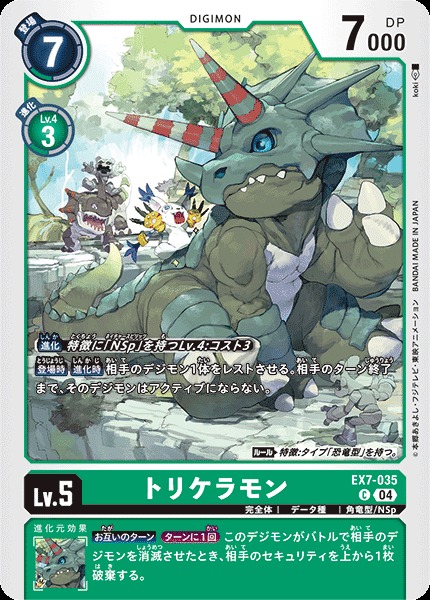 在草食類恐龍類型中實力數一數二的角龍型數碼寶貝,比起成熟期的角龍獸全身的鎧甲與犄角都更加堅韌許多,防禦能力可謂是同類型數碼寶貝中頂尖的存在。雖然說平時行動一如它的性格一樣溫和遲緩,但是一旦遇到外敵時,它就會展現出完全無法從外表想像的迅捷衝刺攻擊。在超高硬度的三隻角底下,就算是礦物型數碼寶貝最自豪的堅硬軀體也會被輕易粉碎。