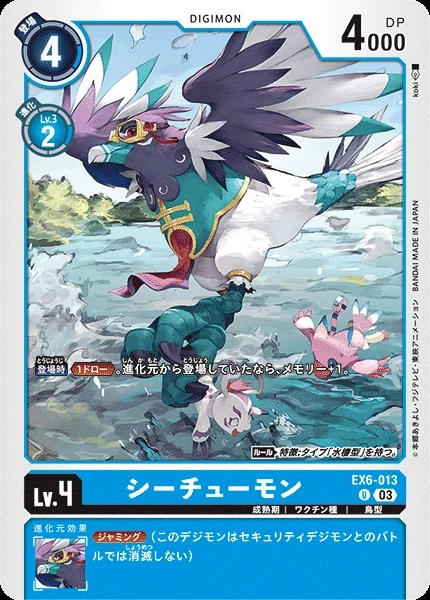 能在天空与水域之间自由移动的特异鸟型数码宝贝。数码核心中包含了鱼类的数据,能够以飞行时的姿势直接冲入水中,用飞翔般的泳姿进行狩猎。据说之所以会配戴护目镜,是为了在游泳时保有清晰的视野。栖息于冰冷的湖畔或河川,是一旦水温提升就会寻求新居所,旅行于全数码世界的候鸟。据说看到为了寻巢而四处飞翔的喜鹊兽即是幸运的征兆,因此也以带来吉兆的数码宝贝闻名而深受喜爱。单次进食的食量非常少,有着使用技能将剩下的粮食冻成冰块保存的习性。