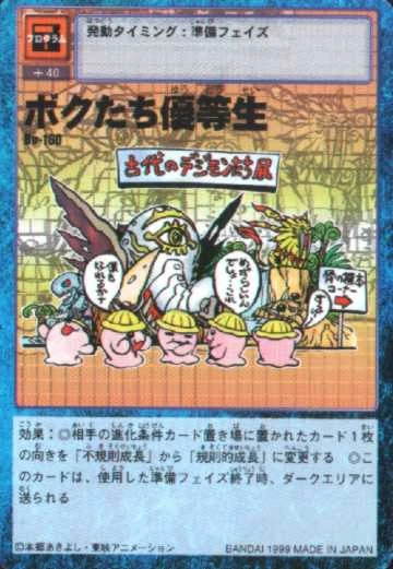 | 纪念套组 | 特选档案第一弹 • 特选档案第二弹 • 数码宝贝15周年纪念套组 • 数码宝贝大冒险15周年纪念套组 • 数码宝贝大冒险tri. 第一代纪念套组 • 数码宝贝20周年纪念套组 | |