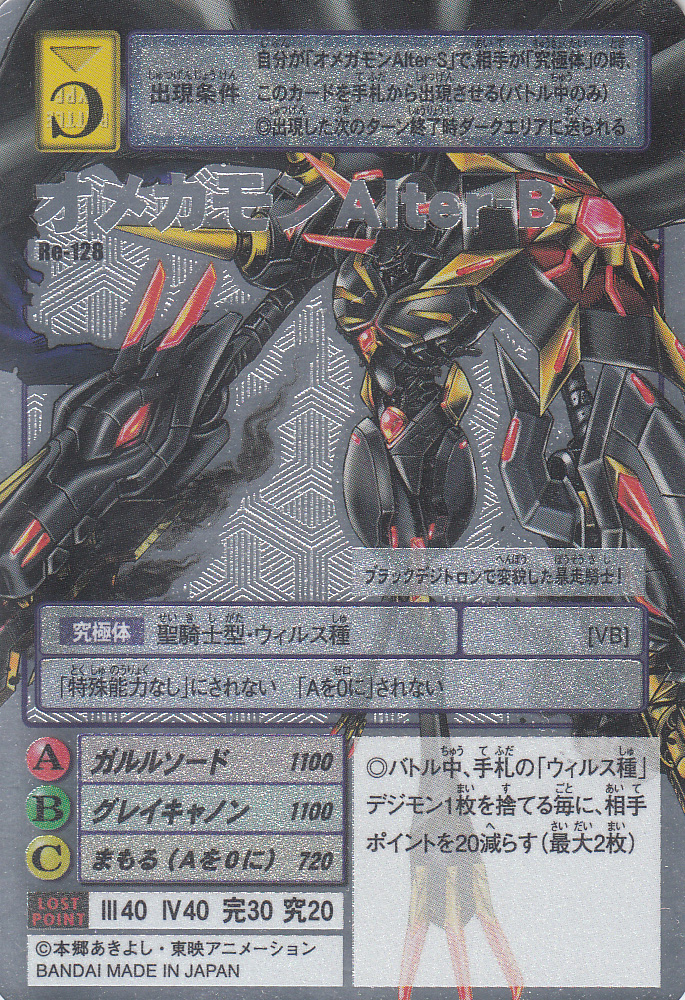 奥米加兽 Alter-S的身体不知被谁混入了会将姿态变为黑色的分泌物「黑Digitron」而暂时变为黑色姿态。在此姿态期间力量增强,但丧失自我陷入失控状态。