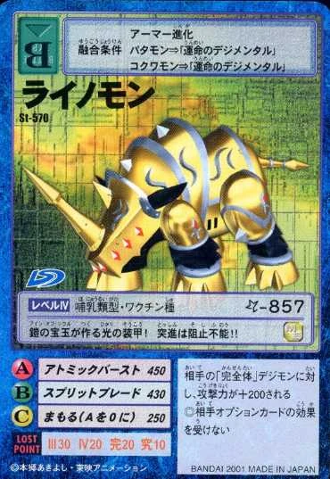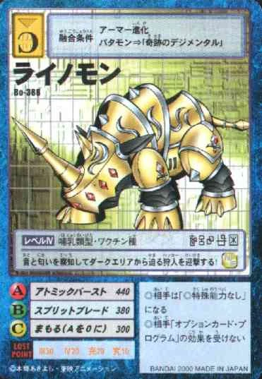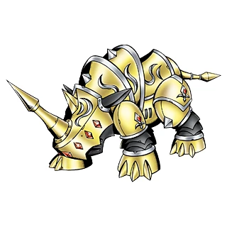 受到「奇蹟裝甲」之力影響而進化的裝甲體哺乳類型數碼寶貝。全身上下由數碼合金製的鎧甲包裹,這鎧甲不僅厚實,表面還是鏡面設計,因此不會被物理攻擊破壞,甚至連雷射攻擊也無可奈何。另外,犀牛獸看起來動作遲鈍,但是會將充裕的能量化為動能,因此能夠飛快移動。從犀牛獸的體格來看,那速度之快令人難以聯想。必殺技是讓鑲嵌在鎧甲中的寶玉「無限之光」射出的光芒如防護罩般籠罩全身,接著衝向敵人的「原子爆破」。被這一招擊中的數碼寶貝將會被分解成數碼數據的最小單位「0」與「1」,無法復原。