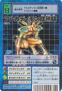 以人工手法誕生,再次成長的阿卡迪獸。受詛咒的身軀隨著成長變得高大和瘦削,原本背上的紅色尖刺轉變為羽狀的翅膀,在必要時能夠伸長並以極快的速度進行飛行。手上鐮刀變為巨大的雙腕,保留著之前型態的伸縮能力時並蘊含者之前不能比擬的力量,另外手上的長棘般的突出也會在攻擊時伸出刺穿並吸收對方的能量以壓制對方的反擊行動與逃跑企圖,加上更加強大的雙足與同樣能吸收對手資料的尾巴,讓它對於吸收對手資料更加得心應手。可以確認的是它擁有著在戰鬥中不斷藉由吸收成長的能力,但是即使是它表達了強大的捕食本能,它是否擁有自我意識仍然是未知的。據說即使被它襲擊的數碼寶貝能夠逃離它的追擊也會因身體資料受損過重而死亡。其餘詳情不明,仍在調查中。