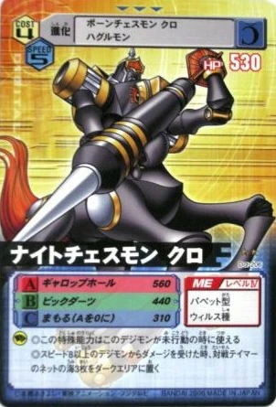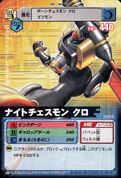 擅長投擲巨大飛鏢的數碼寶貝。雖然不擅長近身戰,但是能夠以如同純血種馬的強勁腳力飛越敵人,以跳躍的方式擾亂對方。口頭禪是「來單挑吧!」。必殺技有「巨型飛鏢」與跳往高空後踩向敵人的衝擊招式,「策馬奔騰」。另外還有「槍騎之襲」,這是扛起飛鏢衝向敵人的招式。