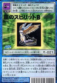 | 効果: | ◎自分のデジモンボックスに、出現条件を満たした「スピリット進化」デジモンを出現させる。出現したデジモンは能力「くうちゅう」を得る。更にバトル中、手札のデジモンカード2枚を捨て攻撃力が2倍になる(最大2枚。出現中はこのカードを除き、自分援護ボックスに「オプションカード」を置けない。バトルに勝つと相手はロストポイント「完」になる) |